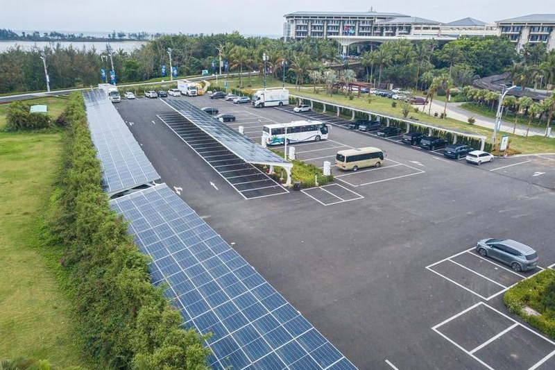 Въздушна снимка с дрон, направена на 16 март 2025 г., показва фотоволтаичните устройства на паркинг в демонстрационната зона Боао с нулев въглерод в Боао, провинция Хайнан в Южен Китай. [Photo/Xinhua]